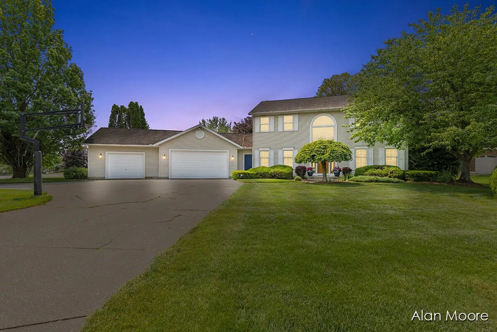 6574 Gran Via Dr. Rockford, MI - A Stunning Lakefront Retreat. Discover unparalleled lakeside living in this magnificent 5-bedroom, 3.5-bath traditional two-story home nestled on a sprawling .668 acre lot, with 71 feet of private frontage on all-sports Lake Bella Vista. The spacious side yard is perfect for pickup soccer, football, and various yard games. Enjoy a private upper-level deck, a lower patio, and a relaxing hot tub area. Boasting over 4,000 square feet of exquisitely finished living space, this residence is a haven for entertainers and residents alike, offering breathtaking lake views, a private sandy beach, and a serene lakeside patio. The upper level features a luxurious primary en-suite, three additional bedrooms, and a second full bath, providing ample space for all. The heart of the home is the updated gourmet kitchen, showcasing granite countertops, a large center island with a snack bar, and an inviting gathering area that opens to stunning lake vistas. The main floor exudes elegance with a cozy living room featuring a gas fireplace, formal dining room, and a sophisticated office with built-ins. The walk-out lower level is designed for relaxation and recreation, offering a family room with another fireplace, an additional bedroom, full bath, rec room, second office, wet bar, and an exercise room. Outside, an expansive deck overlooks the lake, complementing the large lot ideal for gatherings. Modern conveniences abound with a three-stall garage, hot tub, generator hookup, underground sprinkling, and an included dock for effortless lake access. Perfectly situated in the acclaimed Rockford School District, near the White Pine Trail and local amenities, this home blends timeless charm with modern upgrades. Act fast to claim this lakefront gem and savor the summer months in style!